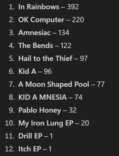 A week ago I tooted my ranking of all Radiohead albums: https://metalhead.club/@derthomas/115099517849918878