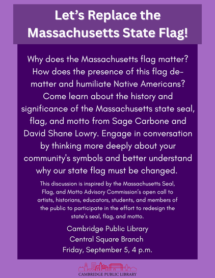 Why does the Massachusetts State flag matter? Learn about the history and significance of the Massachusetts state seal, flag, and motto from Sage Carbone and David Shane Lowry. Think more deeply about your community's symbols and better understand why our state flag must be changed. This discussion is inspired by the Massachusetts Seal, Flag, and Motto Advisory Commission’s open call to artists, historians, educators, students, and members of the public to participate in the effort to redesign the state’s seal, flag, and motto. Established by the Legislature in 2024, the Commission is tasked with developing and recommending new symbols to represent the state through a statewide public process. Learn more about the Massachusetts Seal, Flag, and Motto Advisory Commission’s open call to artists.
