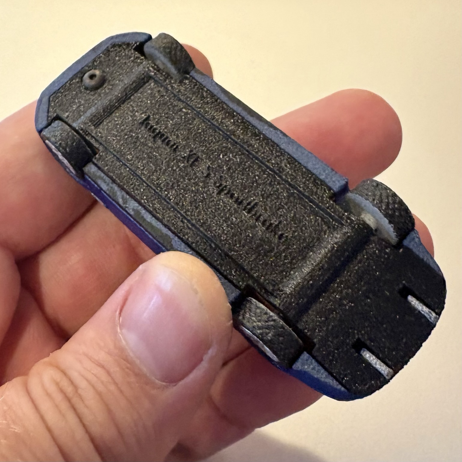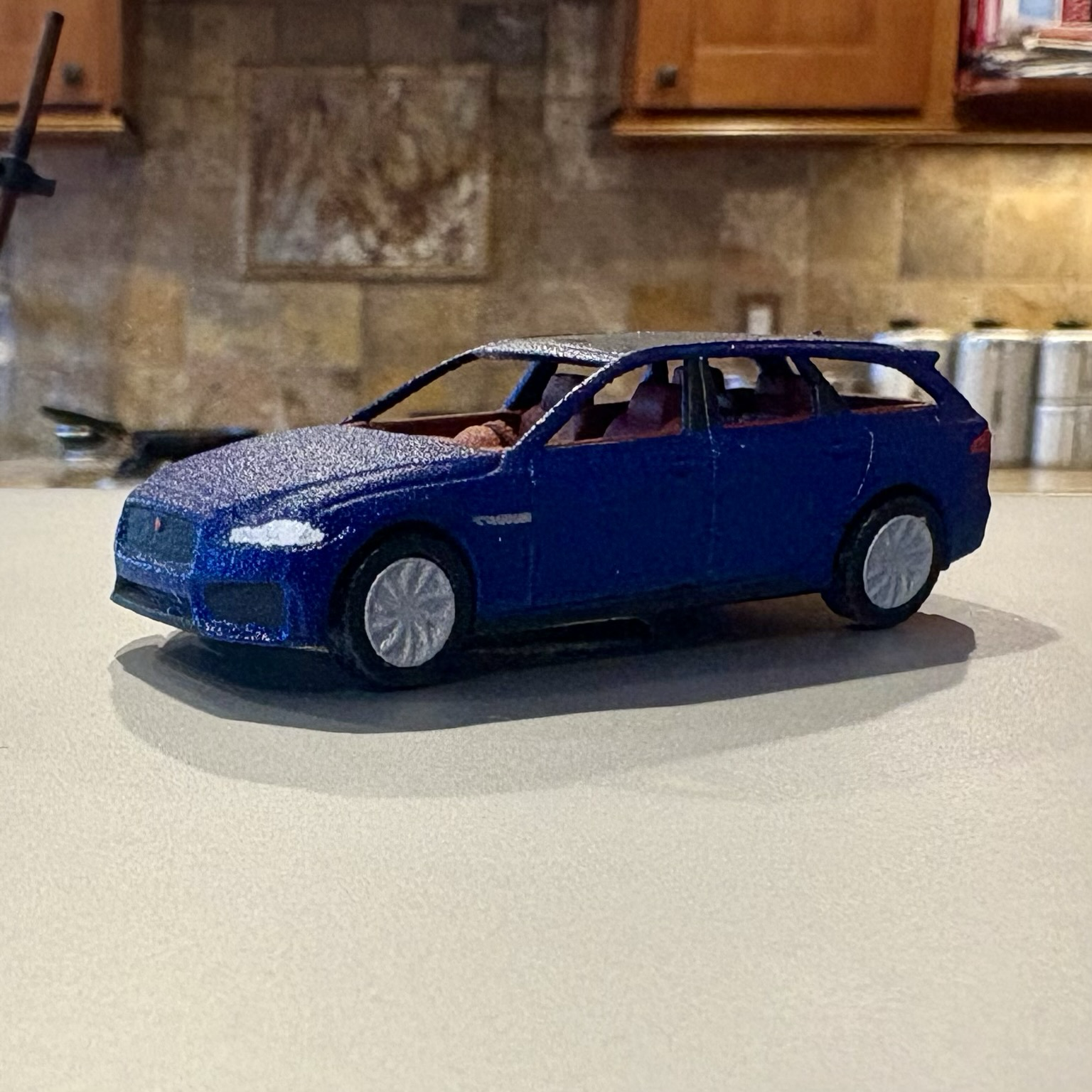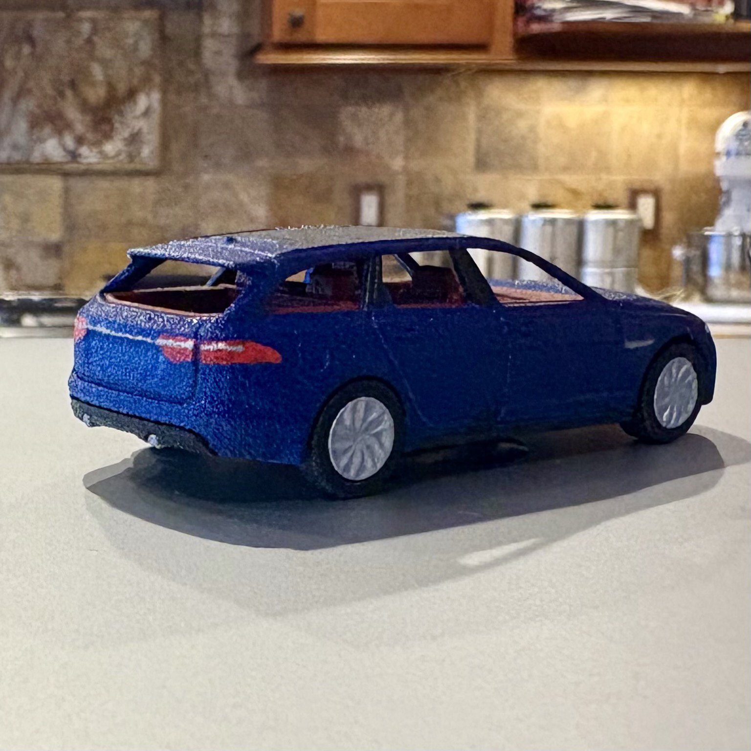Day 1/84: This is the first complete car I ever printed, a Volvo 760 Turbo wagon. There was obviously some learning curve involved; the wheels were too big, and I didn't make the front headrest supports thick enough to survive printing. Not bad overall for a first try, though. #WeirdCarMastodon #164scale #3dPrinting
