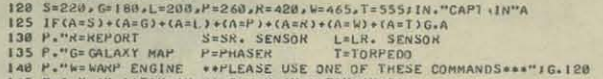 There is now an ~800x800 galaxy to explore. Short range scanners reveal a 3x5 region, and the player can jump around by giving warp factors and bearings. There's also an occasional stable wormhole... but you won't know where it leads unless you jump through!