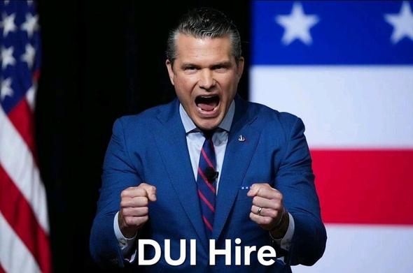 Photo of Pete Hegseth, with enraged face and chest-high clenched fists, overlaid with the words, "DUI hire".