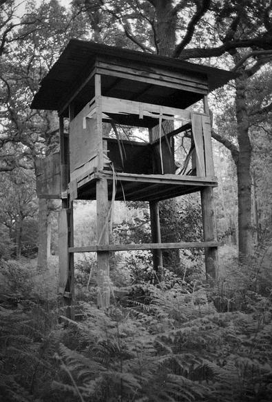 Broken tower. I think this must be an observation tower for shoots in this woodland, though I've never seen another one like it.
