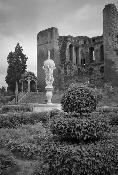Castle garden. View of the "slighted" keep from the reconstructed Elizabethan garden at Kenilworth.