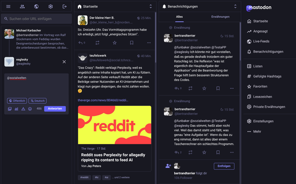 Man bekommt dann die Möglichkeit mehrere Spalten zu haben, wie früher bei Tweetdeck. Die Standardansicht sieht eher aus, wie die Oberfläche z.B. bei Bluesky.