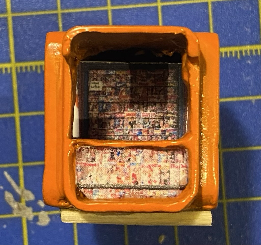 A bit of work on my K67 H0 scale kiosk. Printed some magazine shelves for the front, put a background with more magazines.