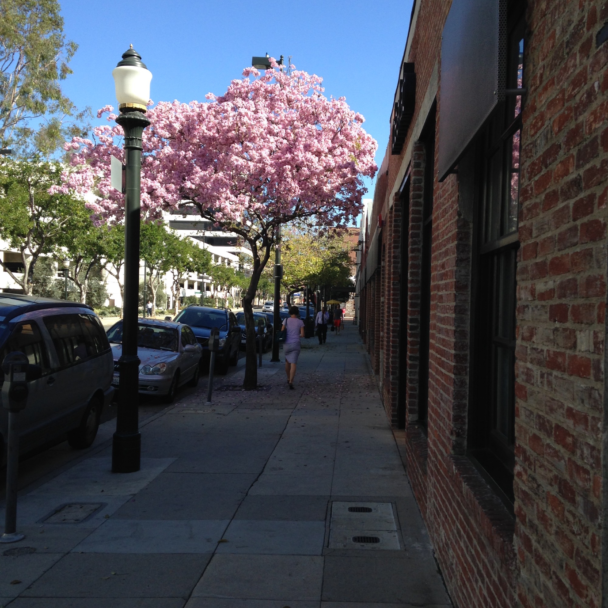 A pink trumpet tree lining a Pasadena street.