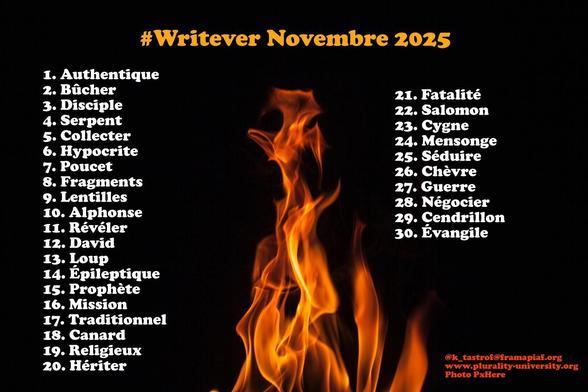 Et voilà la liste du mois de novembre pour le Writever. La patronne @k_tastrof s'est inspirée, pour cette liste, de son prochain roman 'Le Nouvel Évangile de Myriam" (prévu pour février).