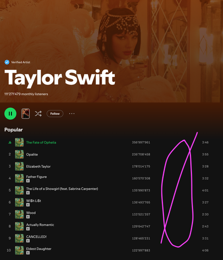 Since some people think I'm making things up: This is my #Spotify. Zero liked songs from this interpret. Skimmed through top 5 and 🤷. I am pretty certain I've never heard any of those. Not my genre. Not in my bubble.