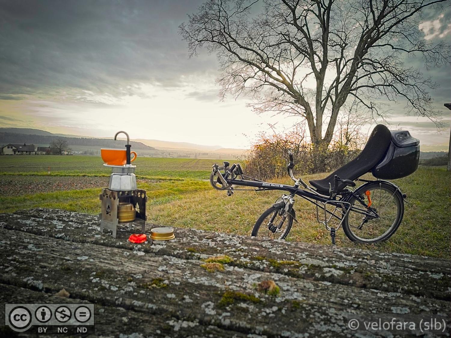 Coffeeneuring without walls - the seventh ride. I stopped at a weathered bench and made my afternoon coffee. Watching the sunset while waiting and doing nothing—fantastic!