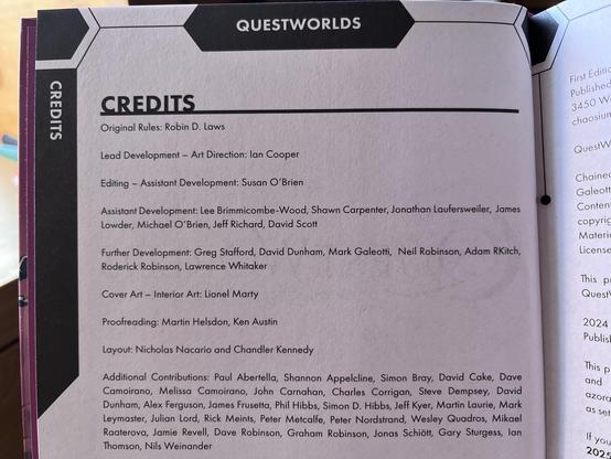 In the post today a print copy of Chaosium's QuestWorlds / Hero Wars / HeroQuest / whatever they're calling it this week. Love the compact format (the endpapers and ribbon bookmark matching the colours on the cover is a nice touch), although the pages look to be glued rather than sewn. There's not much interior art, which is a relief as it's no better than the exterior (maybe they couldn't afford Jon Hodgson for the cover this time), but then again the interior art of the previous edition was pretty dire so I was not expecting much. The layout is also rather mediocre. I really do get the feeling that once Moon Design got their hands on RuneQuest they lost interest in QuestWorlds.