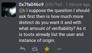 @b I suppose the question I should ask first then is how much more distinct do you want it and with what amount of verifiability? As it is toots already list the user and instance of origin.