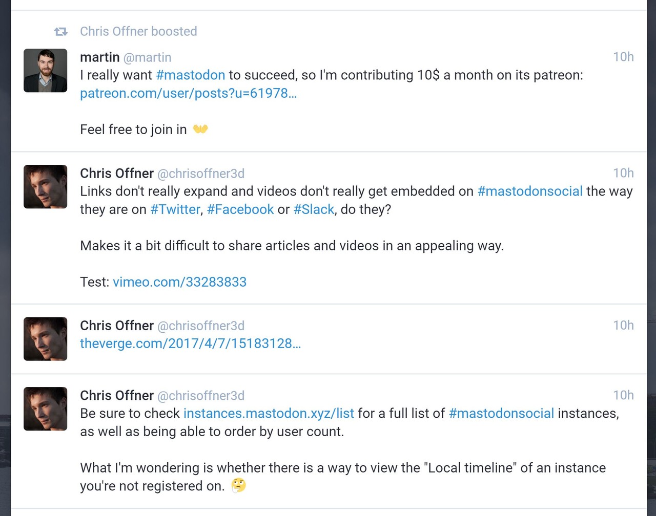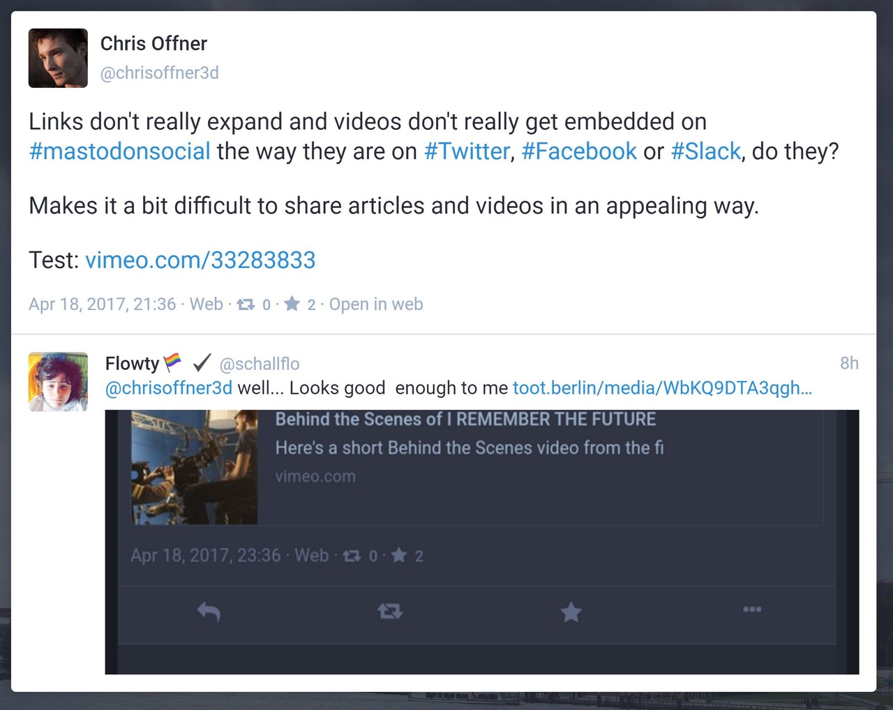 Links don't really expand and videos don't really get embedded on #mastodonsocial the way they are on #Twitter, #Facebook or #Slack, do they?