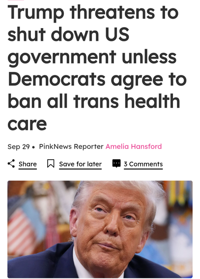 https://www.thepinknews.com/2025/09/29/trans-care-ban-government-shutdown/