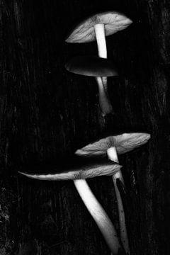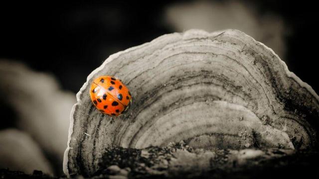 Een lieveheersbeestje op een elfenbankje. Omdat je lieveheersbeestjes vooral in de lente en zomer ziet, en elfenbankjes vooral in de herfst, heb je hier drie seizoenen in een beeld. Jong en oud. De jonge frisheid van het beestje heb ik bewaard, en de oude grauwheid van de herfst in sepia gezet.