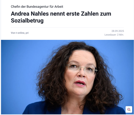 Oh schlimm, Sozialbetrug verursachte letztes Jahr 110 Mio. Schaden. Darunter fallen ganz viele Bagatellen, wie ein zu spät gemeldetes Nebenkostenguthaben. Wegen Kleinigkeiten werden Strafverfahren eingeleitet. In Kriminalisierung der Ärmsten sind wir groß. Zum Vergleich: Der geschätzte Schaden durch Steuerhinterziehung in 2024 liegt bei 100 M I L L I A R D E N! Aber es gibt zu wenig Steuerfahnder. Weiter fordert Nahles einfachere Umsetzung von Sanktionen und mehr davon, ungeachtet der Tatsache, dass Sanktionen den gewünschten Effekt nicht erzielen. Kuschelkurs mit Merz-CDU.