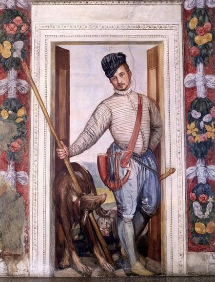 A man in elegant hunting dress, almost stepping out of a fresco with his hounds, could possibly be Veronese himself.