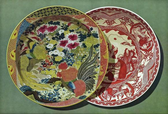 Two Kaga ware dishes. Lithograph, by L. Dulong, published 1875.