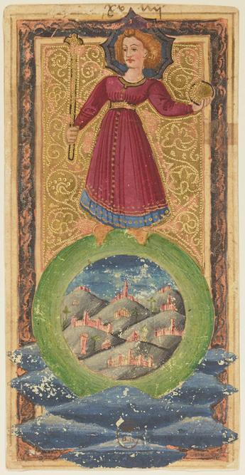 The World tarot card, anonymous (Italian), 1475–1500. The final card in the traditional tarot deck, the imagery symbolises mastery and harmony over the world.