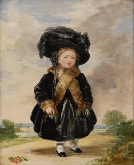 Little Queen Victoria in a big, unwieldy hat and dress.