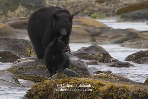 Mama Bear and her cub looking for something to eat at low tide.