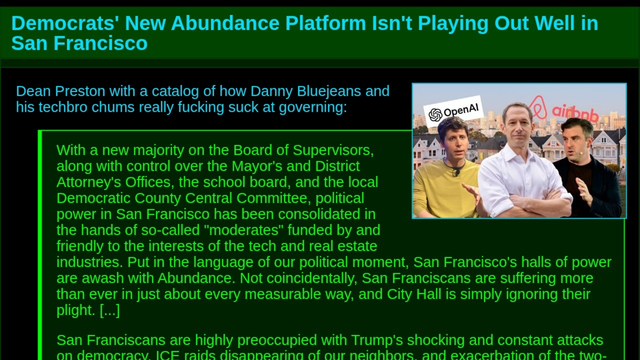 Dean Preston with a catalog of how Danny Bluejeans and his techbro chums really fucking suck at governing: With a new majority on the Board of Supervisors, along with control...