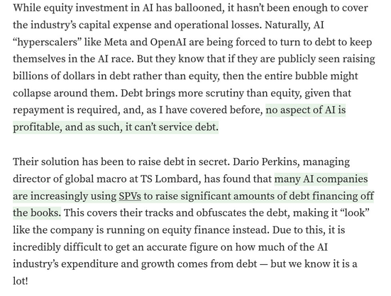 Attached: 1 image AI companies are raising huge amounts of debt off the books https://archive.ph/2025.10.18-083207/https://wlockett.medium.com/the-ai-bubble-is-far-worse-than-we-thought-f070a70a90d7#selection-667.0-687.287 i'm sure it won't prove systemic or anything