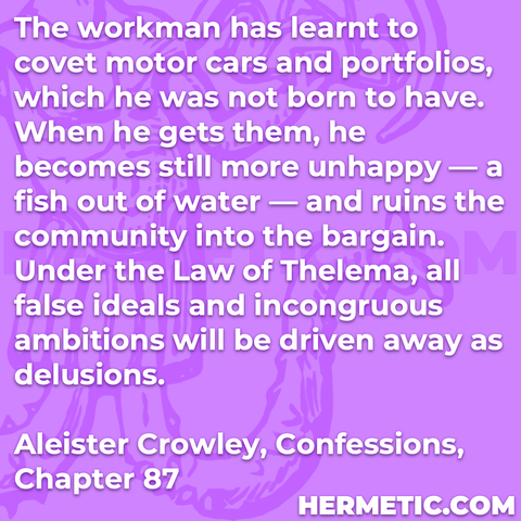 The workman has learnt to covet motor cars and portfolios, which he was not born to have. When he gets them, he becomes still more unhappy — a fish out of water — and ruins the community into the bargain. Under the Law of Thelema, all false ideals and incongruous ambitions will be driven away […]