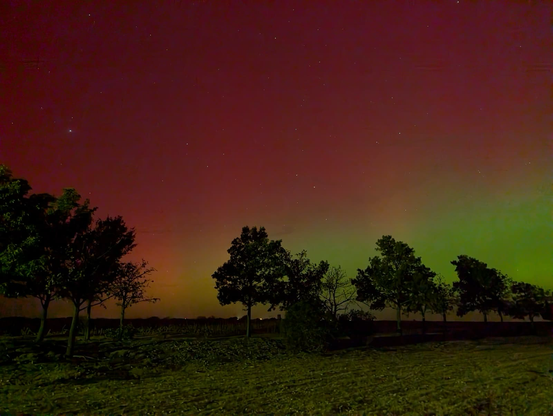 alt: a broad red sky with green in the bottom right of the frame, above some trees