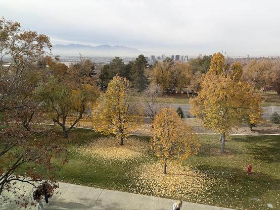 alt: looking out over some mildly colored trees towards downtown SLC with the lake and the Oquirrh range mostly hidden by some haze
