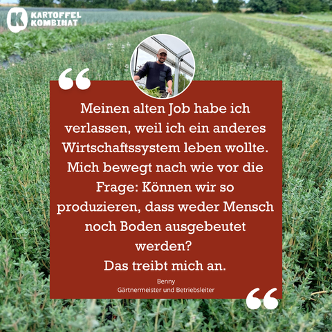 Wenn es jemanden gibt, der das Kartoffelkombinat geprägt hat wie kaum ein anderer, dann ist es Benny. Seit 2013 ist er schon dabei – als Gärtner und mittlerweile als echte Schaltzentrale zwischen den Bereichen in seiner Funktion als Betriebsleiter. Ob Anbauplanung, Organisation oder Überblick behalten: Benny weiß, was läuft.