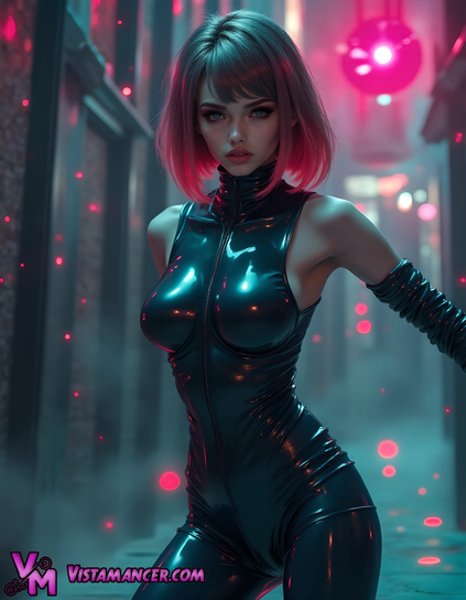 #ResidentEvil #apocalypticAmid the pulse of neon and mist, she moves like a vision born from the circuitry of dreams. Her sleek black bodysuit glows beneath the vibrant hues of magenta and cyan, reflecting light like liquid metal.