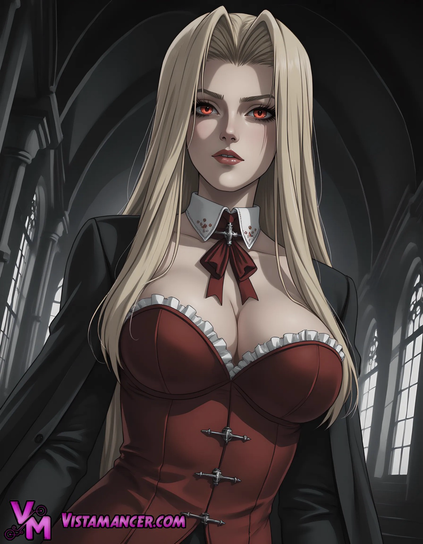 #Hellsing #Vampire #GothicAnimeHer golden locks cascade like a silken waterfall. The gothic pillars and weathered tombstones stand as silent sentinels, their moss-covered surfaces echoing tales of forgotten souls.