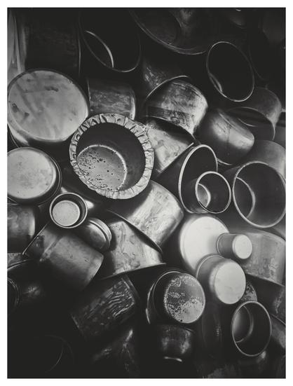 #metalware #pots #kitchenware #stacked #texture #worn #blackandwhite #bnw #monochrome #photography #museum